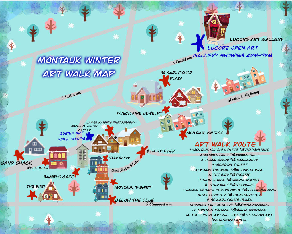 Bundle up and celebrate the creative spirit of Montauk this winter! Join us for our first Winter Art Walk, brought to you by the Montauk Chamber of Commerce, The Lucore Art Gallery and Montauk Artists Association. A festive afternoon designed to bring warmth, color, and community to downtown Montauk during the quiet season.